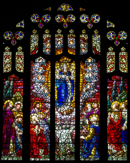 The official name of our parish is St. Mary of the Assumption Parish; and so, the main window in the choir loft over the street entrance to our building is The Assumption of Mary.